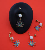 This belly button ring is a fun addition to add to your collection! Crafted with gold pvd 316L stainless steel and featuring a dangling pot leaf design filled with tie dye, sparkling green and blue enamel. Complete with two synthetic, white opal gems, this piece is designed to fit healed navel piercings and measuring 14G with a 3/8” (10mm) barbell length. Externally threaded. The top gem measures 5mm in size, the bottom gem 8mm, and the stunning design measures 16mm x 20mm.