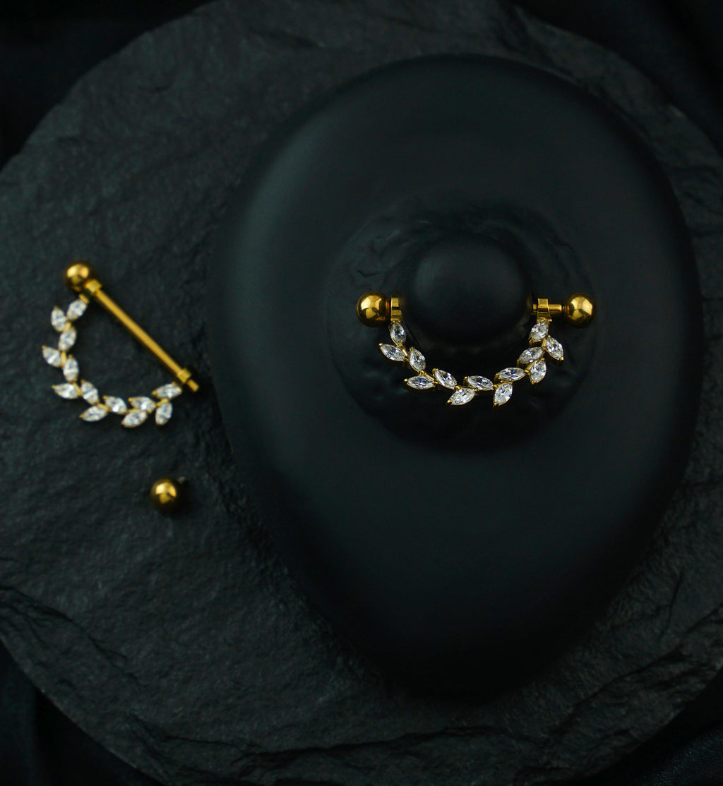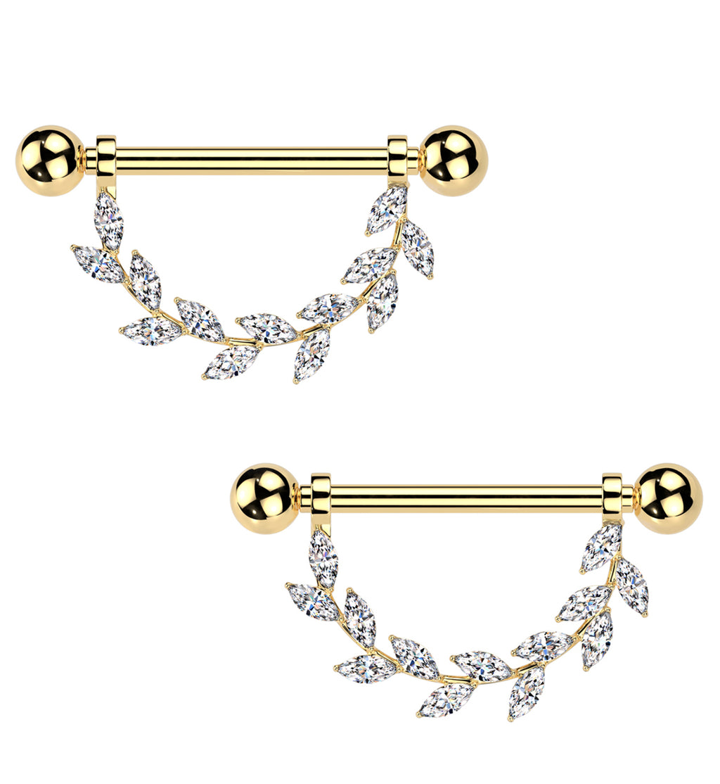 Add some golden shine with our Wreath Clear CZ Internally Threaded Titanium Nipple Barbells. Sold in pairs, these barbells are 14G with a wearable length of 9/16" (14mm). The ball ends are internally threaded and measure about 4mm each. The ASTM F-136 titanium implant grade material ensures both quality and safety and is encased with gold pvd. The clear marquise CZ gems wrap under the nipple for a beautiful accent! Sold in pairs.