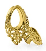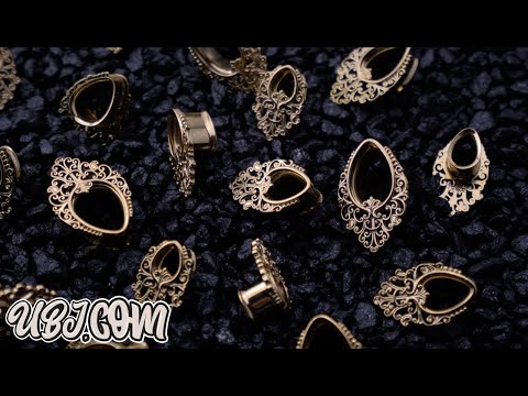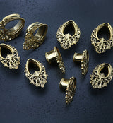 Double flared teardrop stainless steel tunnels with a brass filigree design. Made from gold PVD on 316L stainless steel. Wearable area is 10mm. Sold in pairs (2 pcs). For healed lobes. Free domestic shipping.