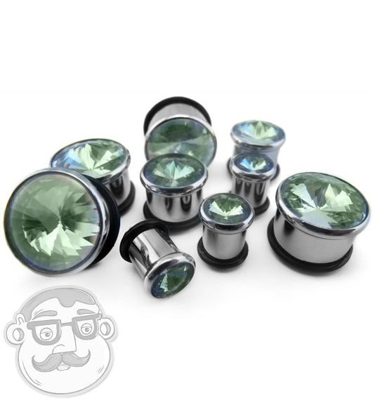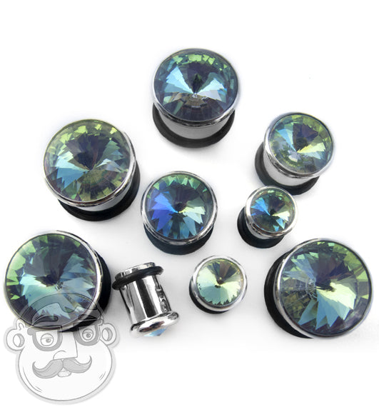 Sold in pairs (2 pieces) Green aurora CZ stone Single flares with "O" rings for the backs 316L stainless steel 2G - 5/8"