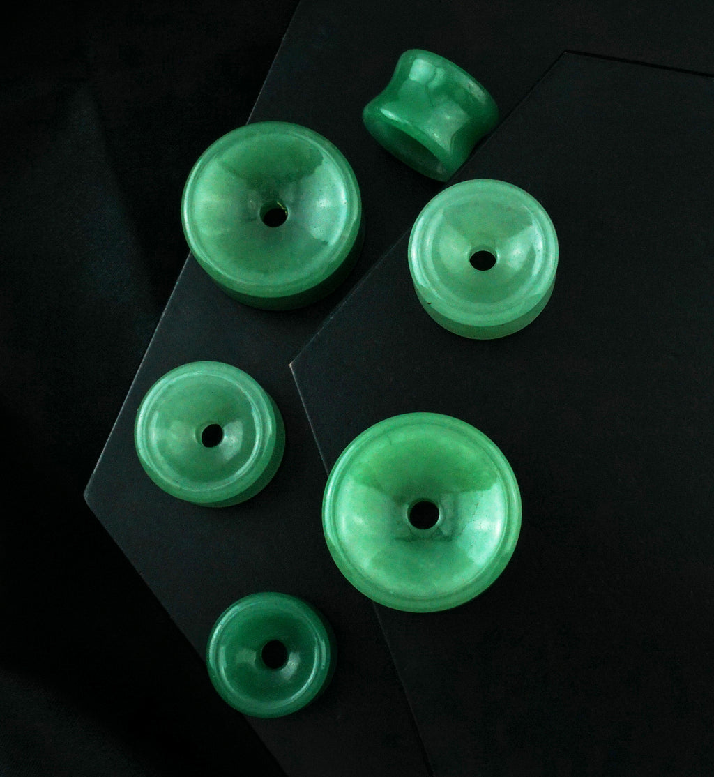 These thick wall tunnels are handcrafted from beautiful green aventurine stone. These double flare shaped tunnels are concave and sold in pairs. Available in sizes 9/16" (14mm) up to 1 & 1/2" (38mm), with unique color and pattern variations. Perfect for healed lobes and adding a touch of natural stone flair to your style. Can be worn with plug hoops! Make sure the plug hoops have a wide enough opening to accommodate the thick walls of these tunnels.