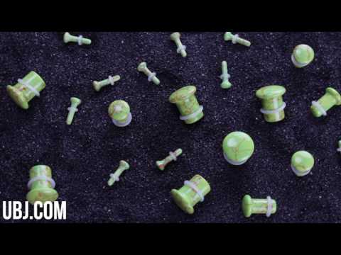 Green Howlite stone plugs that includes "O" rings and is offered in a range of sizes from 8G (3mm) to 1/2" (12mm) and is 12mm in length. The plugs have been polished to a smooth, glossy finish, perfect for daily wear. Sold in pairs (2pcs).