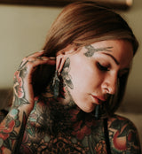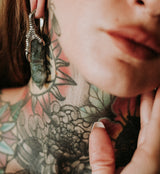 Handcrafted white brass ear weights with a claw design atop a green moss agate piece. Height: 70mm, width: 20mm. Height and width are approximate as these are handcrafted. Size is 6G (4mm) with an approximate weight of 19 grams each. Sold in pairs (2pcs).
