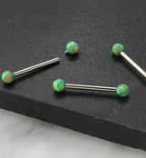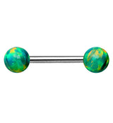 Stay fanciful with our green opalite barbell! The 14g straight barbell features 316L stainless steel construction with secure internal threading. Choose your length size: 9/16" (14mm) or 5/8" (16mm). Opalite size depends on barbell length. Synthetic green opalite provides a shimmering iridescent effect for a lush tropical vibe. Ideal for healed piercings only. Sold individually, order two to complete your pair!