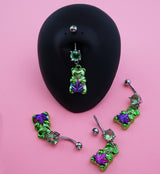 This belly button ring is a fun addition to add to your collection! Crafted with a 316L stainless steel barbell and featuring a green pvd 316L stainless steel gummy bear design holding a rainbow pvd pot leaf. Complete with two dazzling green CZ gems, this piece is designed to fit healed navel piercings and measuring 14G with a 3/8” (10mm) barbell length. Externally threaded. The top gem measures 5mm in size, the bottom gem 8mm, and the stunning design measures 18mm x 12mm.