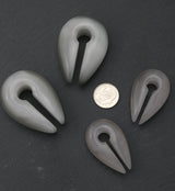 Cat's eye glass keyhole ear weights in a light grey color. Made from glass and available in two sizes! Small measures 40mm x 25mm and weighs approximately 22 grams each. The Large measures about 50mm x 35mm and weighs approximately 36 grams each. Sold in pairs (2 pcs).