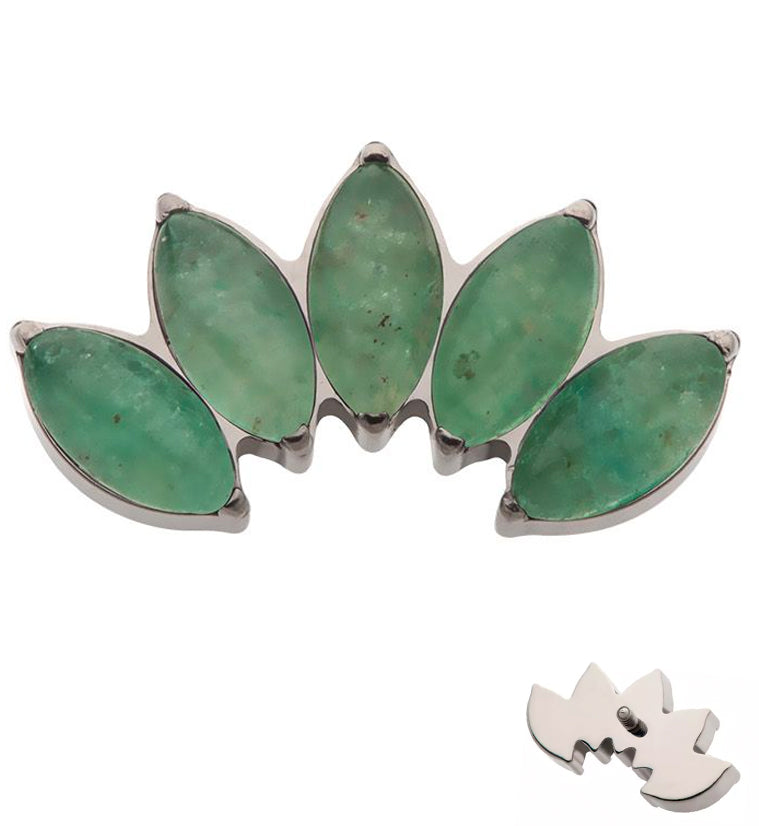 Lovely internally threaded top piece that has a five marquise, aquamarine stone gem design. Made from ASTM F-136 titanium. Measures about 11.5mm x 6mm. 16G. M0.9 threading. Sold individually (top piece only).