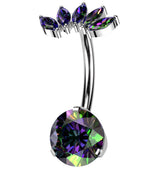 This Half Crown Black Aurora CZ Top Titanium Threadless Belly Button Ring has a fun, marquise black aurora cz gem arch design on top. Made with ASTM F-136 titanium to ensure quality and safety while wearing, the ring has a size of 14G and a 3/8" (10mm) length. The threadless push pin closure is secured with an arched, marquise, black aurora cz top design measuring about 12mm x 5mm. Bottom CZ is 8mm, both are black aurora cubic zirconia gems. Sold individually (1pc).