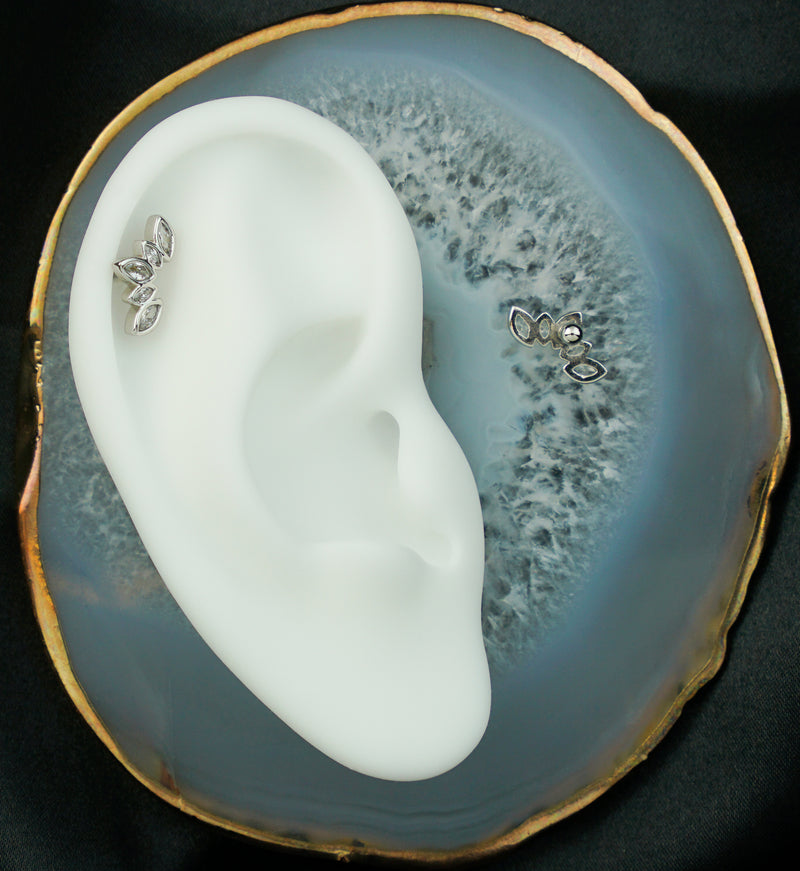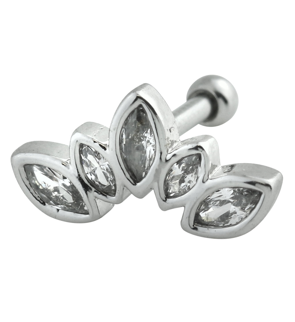Stainless steel cartilage/tragus barbell with an arched design made with marquise-shaped, clear cz gems. Made from 316L stainless steel and externally threaded. Sparkly piece for cartilage or tragus piercings! Size is 16G with a bar length of 1/4" (6mm) with a 2.5mm externally threaded ball end. Top size is 13mm x 7mm. Sold individually and meant for healed piercings.