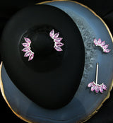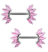 Pretty barbells that are made from 316L stainless steel with a row of marquise-shaped, light pink cz gems in an arched design. Each barbell has a 9/16" (14mm) wearable area and is sized 14G. These are externally threaded, meant for healed piercings and sold in pairs.