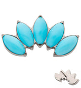 Pretty threadless top piece that has a five marquise, howlite turquoise stone gem design. Made from ASTM F-136 titanium. Measures about 11.5mm x 6mm. Pin size is 25G. Fits most threadless posts. Sold individually (top piece only).