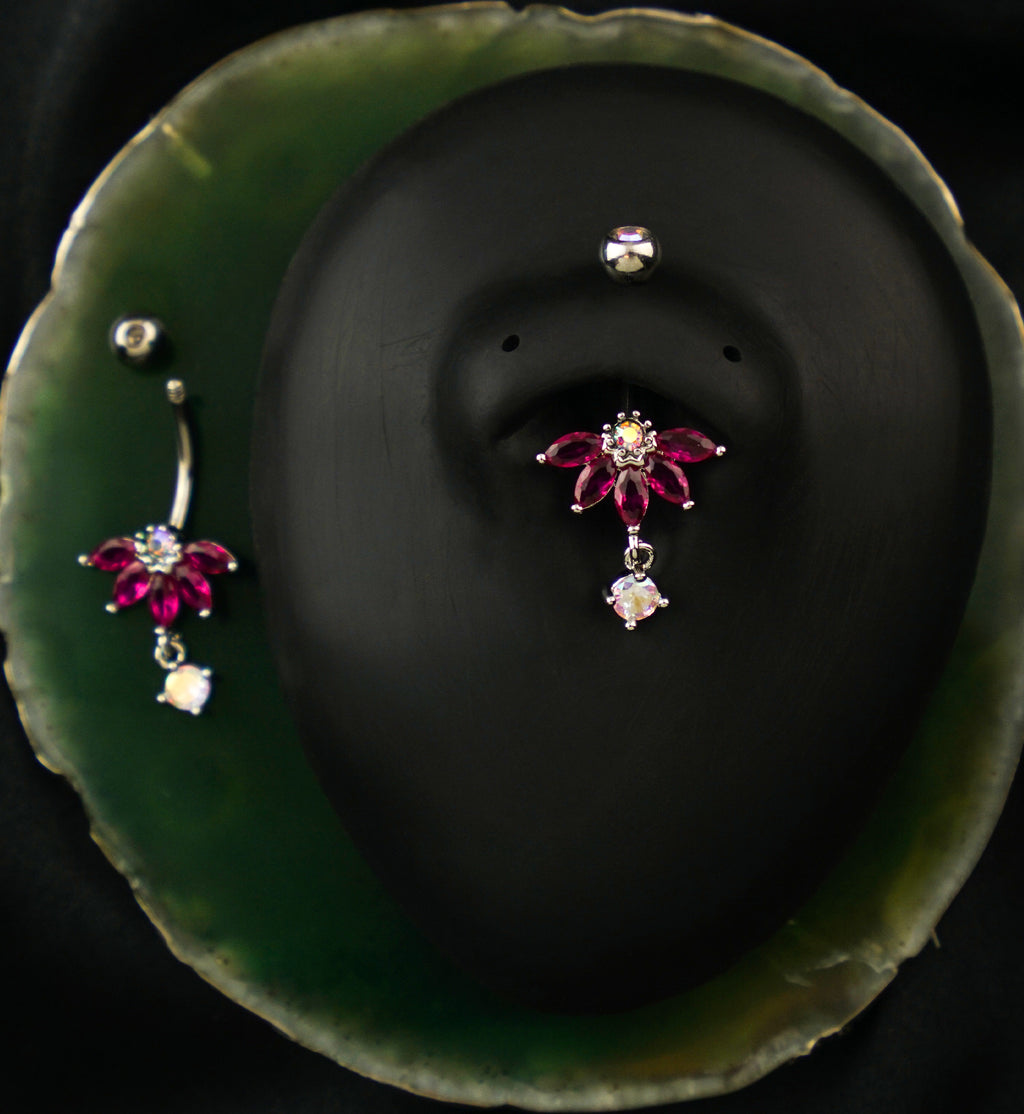Amazing belly ring that has a half flower design that consists of five, marquise, fuchsia cz gems and a rainbow aurora cz gem in the middle. Attached is a dangling, rainbow aurora cz gem. The belly ring has a wearable of 3/8" (10mm) and a size of 14G. Overall, the design measures 17mm x 14mm (including dangles). It is made from surgical 316L stainless steel and is externally threaded with M1.2 threading. For healed piercings only. Sold individually.