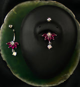 Half Flower Rainbow Aurora And Fuchsia CZ Dangle Stainless Steel Belly Button Ring