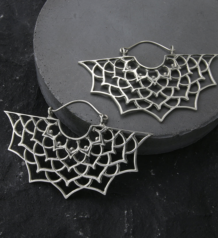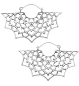 Lightweight white brass earrings/hangers with a half mandala flower design. Size is 18G. Measures at 40mm x 60mm. Weight is about 7 grams each. Made from white brass with a 316L stainless steel wire. Not meant for long term wear. May oxidize under extreme moisture conditions. Sold in pairs (2pc). For healed piercings/lobes.