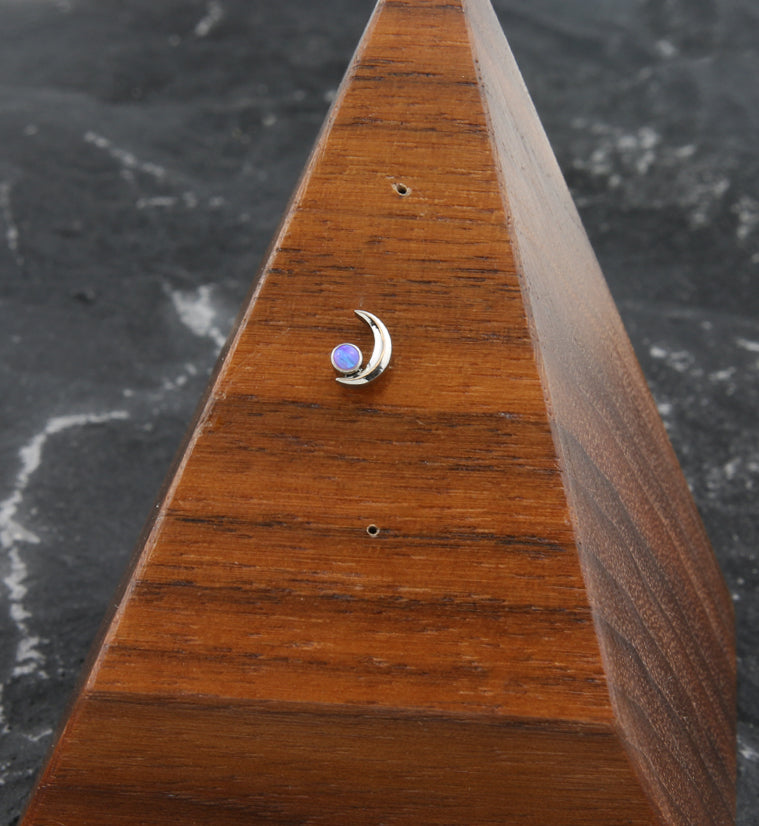 Threadless top piece that has a crescent moon shape design and an accented synthetic purple opal gem. Made from ASTM F-136 titanium. Measures about 6mm x 4mm. 25G pin. Fits most threadless posts. Sold individually (top piece only).