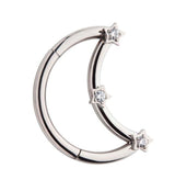 Hinged segment ring made from ASTM F-136 titanium in the shape of a crescent moon, decorated with little stars with clear cz gems in the middle. Hinged style makes for easy opening and closing. Size 16G. Diameter size is 3/8" (10mm). Sold individually.