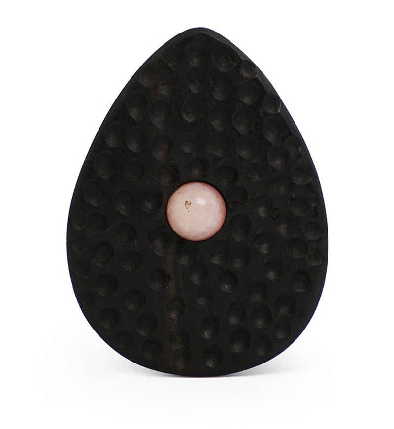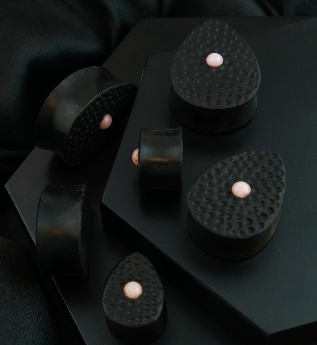 Hammered Areng Wood Teardrop Plugs with Pink Opalite Inlay