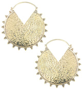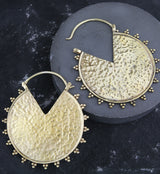 Lightweight yellow brass earrings/hangers with a hammered plate design that has a v-cut out on top and is accented with beads around the outside rim. Hinged design makes this piece easy to open and close. Size is 14G. Measures at 65mm x 75mm. Weight is about 21 grams each. Made from brass. Not meant for long term wear. May oxidize under extreme moisture conditions. Sold in pairs (2pc). For healed piercings/lobes.