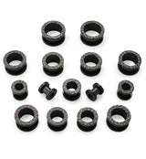 Great tunnels made from black pvd on 316L stainless steel. With a hammered design on the front, these tunnels are externally threaded with screw on backs. Pick from 2G-5/8". Full length is 11mm with a wearable area of 6mm. Sold in pairs (2pcs). For healed lobes.