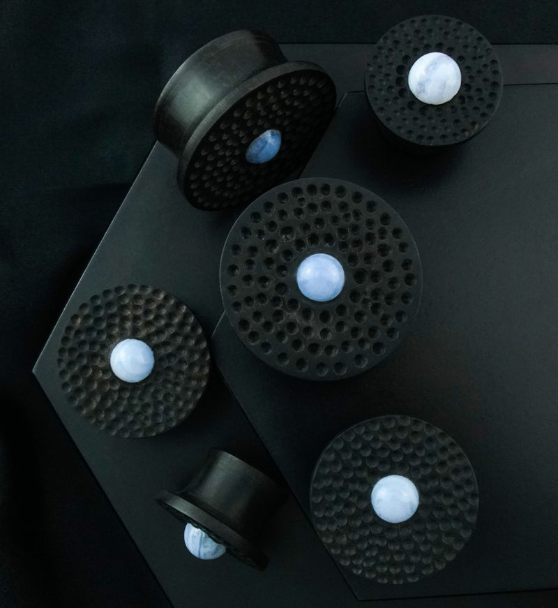 Hammered Blue Lace Agate Stone Areng Wood Mayan Flare Plugs Sale price$23.95