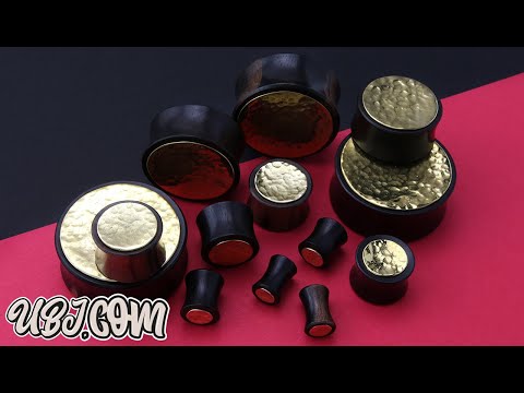 Double flared plugs made from smooth areng wood with a hammered, golden brass inlay. Handcrafted and polished. Sold in pairs (2 pcs). For healed lobes/piercings.