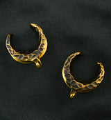 Hammered brass saddles that are durable and great to wear on their own or with ear weights to evenly distribute weight. These have a hook at the bottom that you can easily slide a plug hoop clasp through. Available in sizes 1/2" (12mm) - 5/8" (16mm). The wearable area is about 7-8mm. Full length is about 10mm. Brass is not meant for long term wear. May oxidize under extreme moisture conditions. Designed to support stretched ears wearing heavy ear weights / earrings. For healed piercings. Notice: Large Flares. Sold in pairs (2pc).