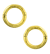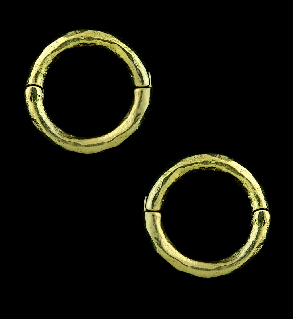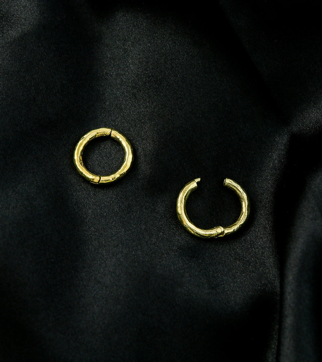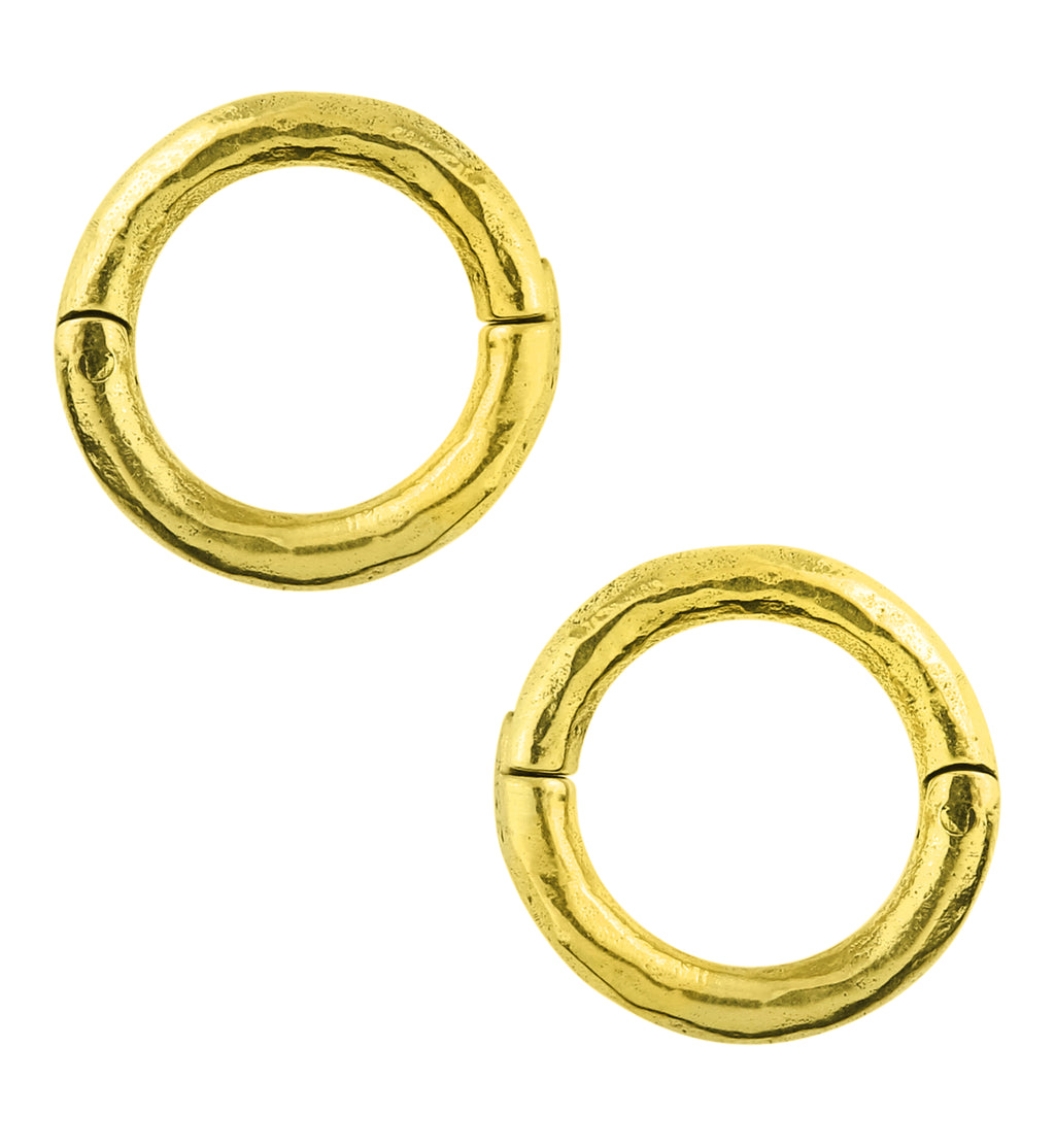 Hoop ear weights that are made from yellow brass and are size 8G (3.2mm) so must be 8G or bigger to wear. Brass is not meant for long term wear, it may oxidize under extreme moisture conditions. These round, hoop-style ear weights have a hammered style and hinged design that opens and clicks closed. Size is about 18mm. For healed piercings/lobes. Sold in pairs (2pcs).