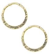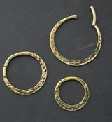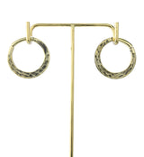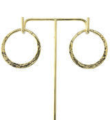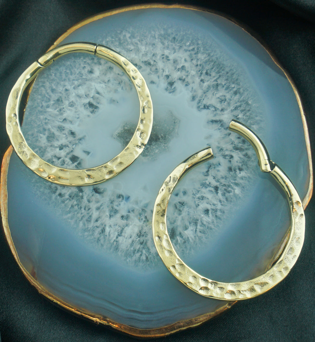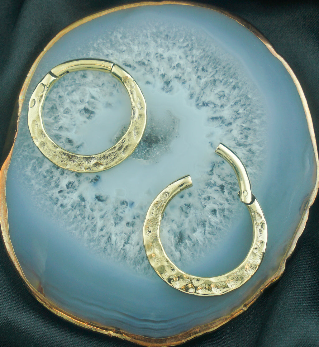 Lightweight yellow brass ear weights/hangers with a hoop design and a hammered accent. Available in Small, Medium, and Large. Small measures 35mm around, Medium is 40mm around, and Large is 50mm around. NOTE: these are handmade so diameter and weight will be approximate. Size is 6g (4mm). Weight: S: 5.7 grams each, M: 8.5 grams each, L: 11 grams each. Made from brass. Complete with a hinged design which makes these earrings easy to open and close. Wear them on their own or stack the sizes for a cool, double or triple hoop look! Not meant for long term wear. May oxidize under extreme moisture conditions. Sold in pairs (2pc). For healed piercings/lobes.