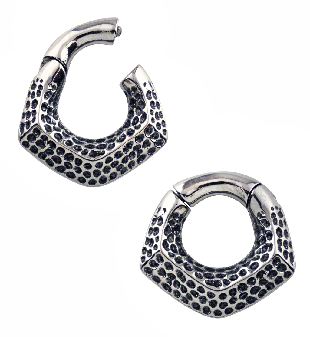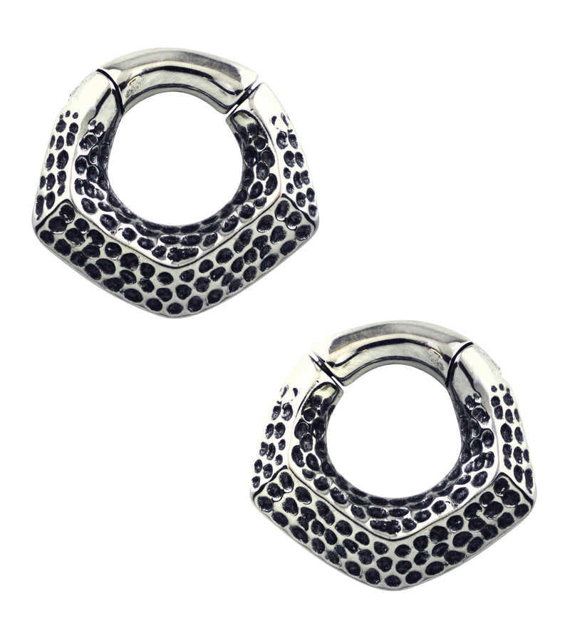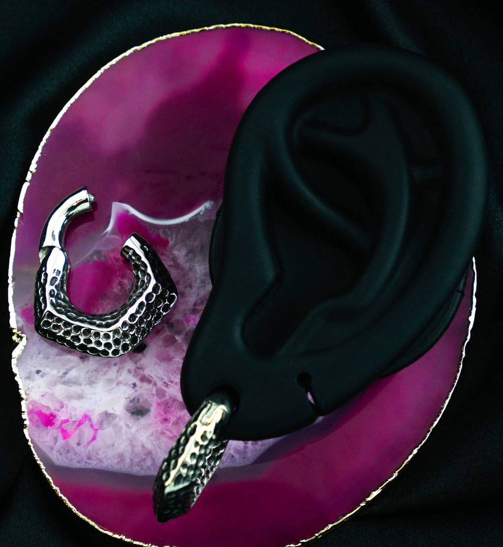 V-shaped hinged ear weights with a hammered texture. Made from surgical 316L stainless steel with a hinged design. Height is 25mm, width is 27mm, weight is 15 grams each. Must be 6G or larger to wear. For healed lobes/piercings. Sold in pairs.