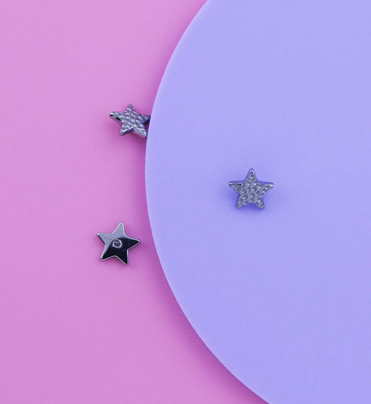 This internally threaded top is made from ASTM F-136 titanium. The design has a star shape with a hammered texture. Design measures about 6mm x 6mm in size. Size is 16G. M0.9 threading. Cool style to add to your piercing! Sold individually (1pc).