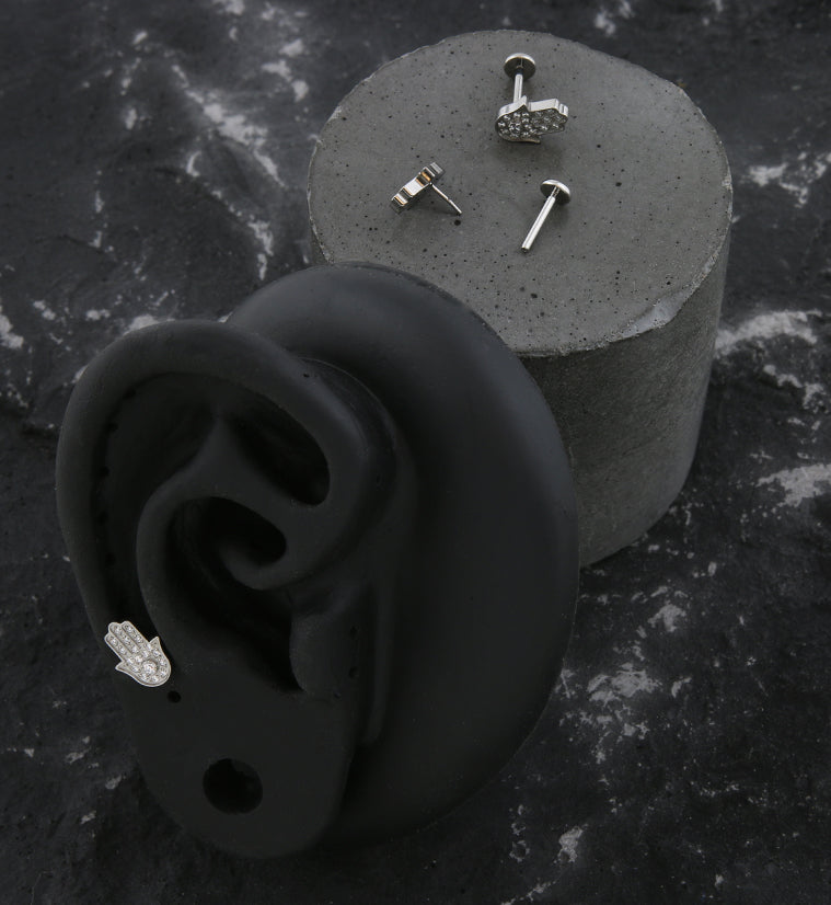 Threadless labret piece that has a hamsa hand design that is filled with clear cz gems. Made from ASTM F-136 titanium with a 4mm disk back. Measures about 10mm x 7mm. Size is 18G with a 5/16" (8mm) length. Sold individually (1pc).