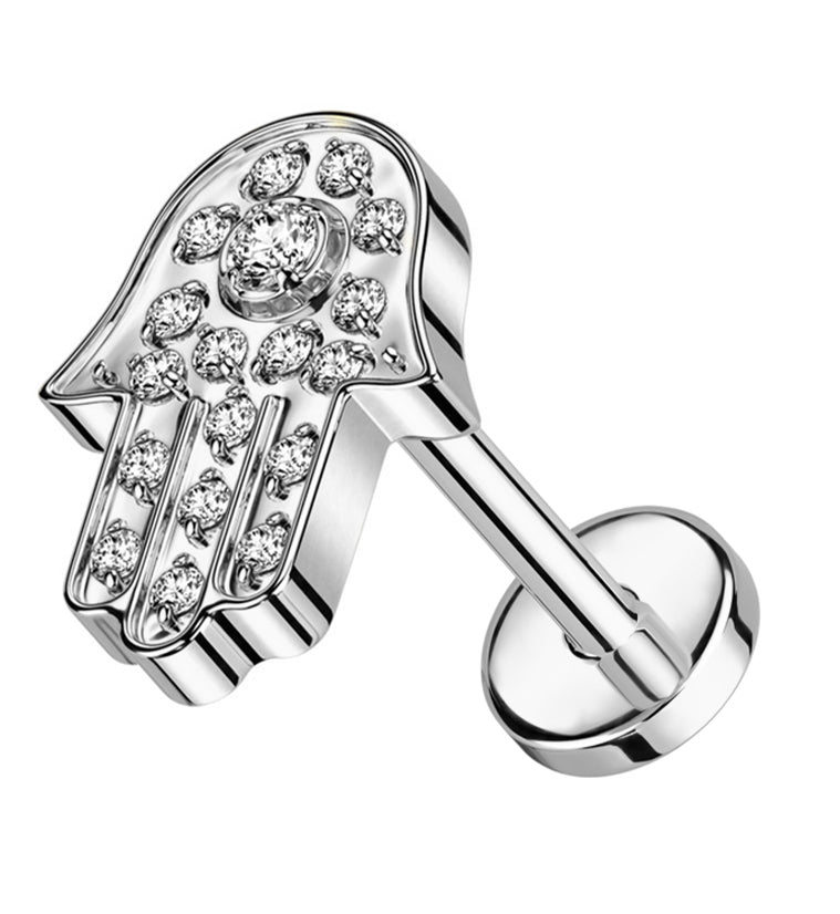 Hamsa Hand Clear CZ Threadless Titanium Labret