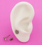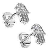 Make a statement with these Hamsa Hand Titanium Threadless Stud Earrings. Made from ASTM F-136 grade titanium, these thoughtfully crafted earrings are lightweight and comfortable to wear. Each stud features one 10mm x 7mm hamsa hand filled with clear CZ gems, with an attached, threadless pin. These are held securely with butterfly backs. The full length of the threadless post is ½” (12mm) with a wearable of 5/16” (8mm). Sold in pairs (2pcs).