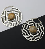 White brass ear weights with a crazy lace agate stone inlay and intricate design. These ear weights measure at 72mm x 67mm and weigh about 41 grams each. They have a 12G sterling silver wire hinge. Each piece will be unique in color and design as these are natural stones and handmade. Sold in pairs (2 pcs). For healed piercings.
