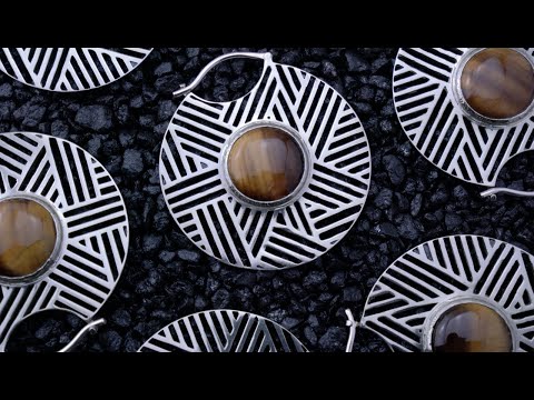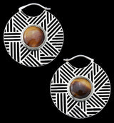 White brass ear weights with a striking tigers eye stone inlay and intricate design. These ear weights measure at 72mm x 67mm and weigh about 41 grams each. They have a 12G sterling silver wire hinge. Sold in pairs (2 pcs). For healed piercings.