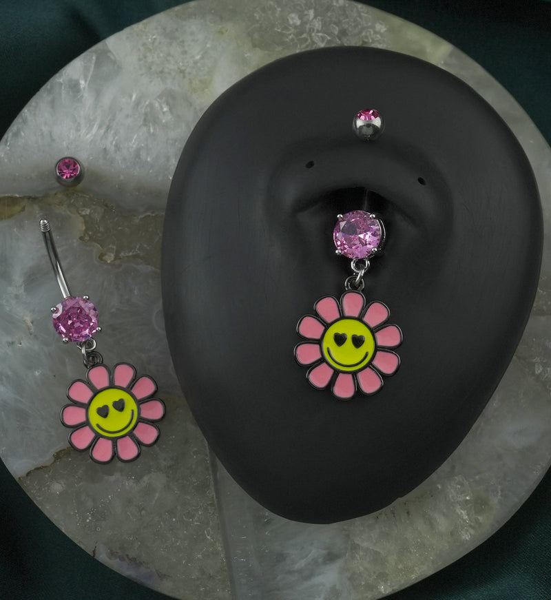 Get happy with our Happy Face Flower Pink CZ Stainless Steel Belly Button Ring. Made of 316L stainless steel, this 14 gauge ring features pink CZ gems and an adorable flower design. It has a 5mm top gem, 8mm bottom gem, and 16mm x 16mm design size. It's perfect for healed piercings. Sold individually.