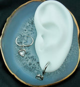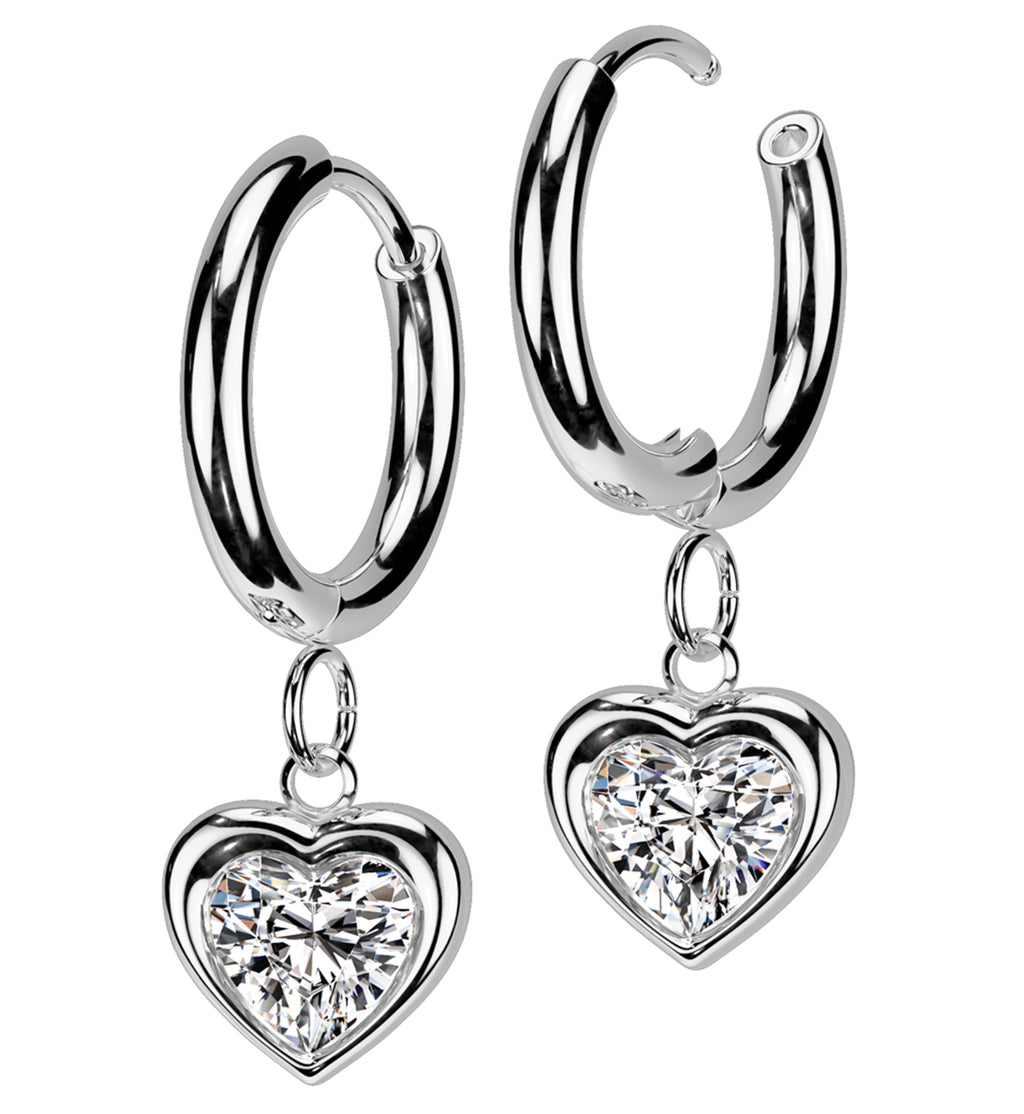 These hoop shaped earrings have a dangling heart shape that has a heart-shaped, clear cz gem in the middle. These are made from 316L stainless steel. They are size 18G with an inner diameter of 3/8" (10mm). Total length is approximately 26mm. The hinged design is easy to open and close. Sold in pairs (2 pieces). For healed piercings.
