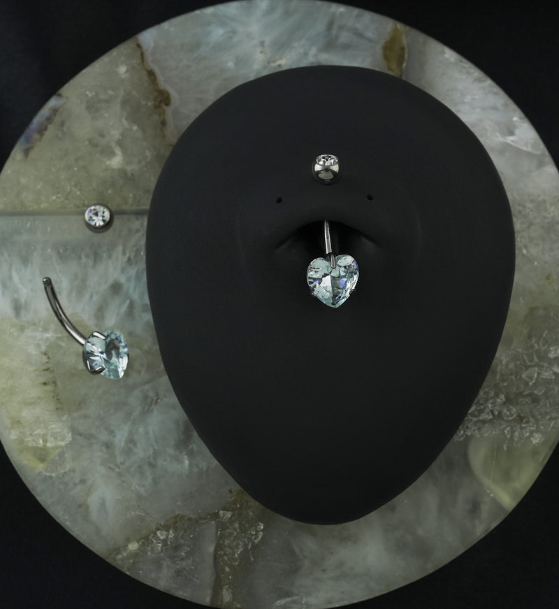 Beautiful heart shaped belly button ring made from 316L stainless steel and is accented with clear, cz gems. Top cz gem is bezel set and heart cz is prong set. Externally threaded with a size of 14G with a 3/8" (10mm) length. Sold individually.