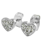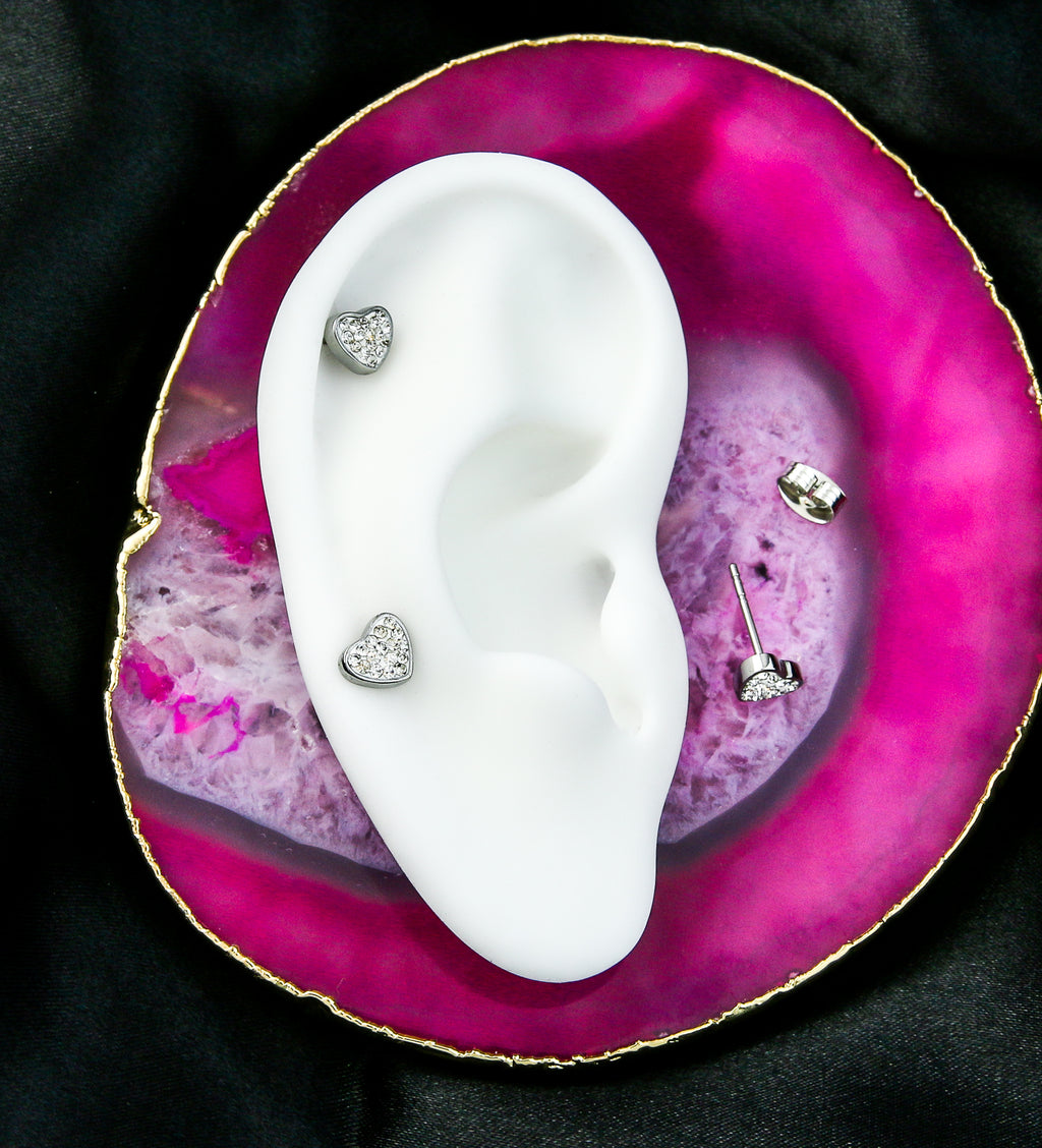 Stud earrings with a heart design on the top that is filled with sparkling, clear cz gems. Made with 316L stainless steel. Size is 20G with a length of about 1/4" (6mm). Each piece has a stud design with a secure butterfly back. Top design measures about 7mm x 6mm. Sold in pairs.