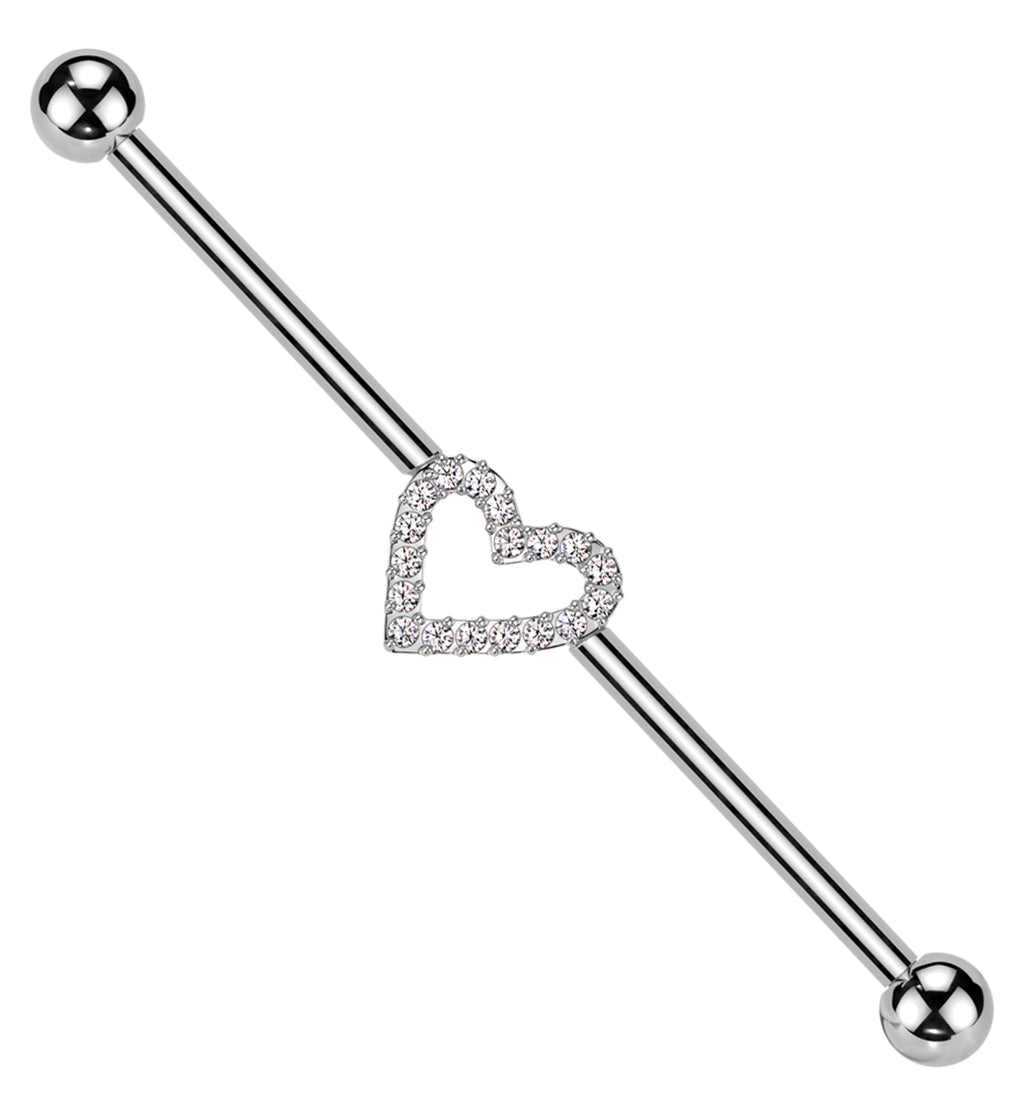 This industrial barbell is made from durable ASTM F-136 titanium and has centered, hollow heart design that is accented with clear cz gems around the rim. The size is 14G with a wearable area of 1 & ½”(38mm) and the balls ends are internally threaded and measure 4mm each. Sold individually and is meant for healed piercings.