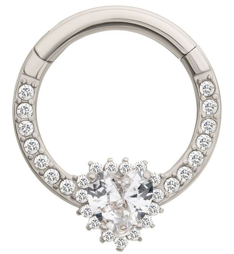 This hinged segment ring has a sparkling row of clear cz gems along the bottom with a centered, heart-shaped, clear cz gem. Made from 316L stainless steel. The inner diameter size is 3/8" (10mm) and you get your choice of gauge size: 16G or 14G. The hinged design makes this piece easy to insert and take out. Sold individually. For healed piercings.