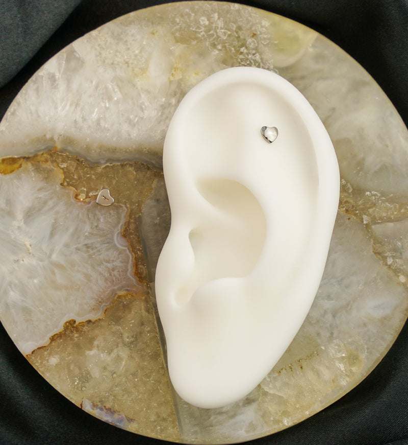 This threadless top has a puff out heart design and smooth/polished texture. It is made from durable ASTM F-136 titanium and is threadless with a 25G pin. The threadless design makes this piece effortless to put in and take out from your piercing. The top design measures about 4mm. Sold individually.