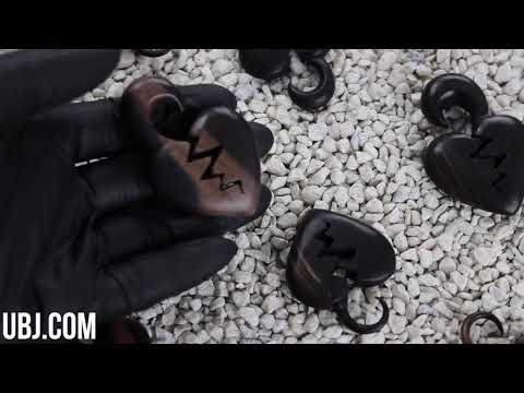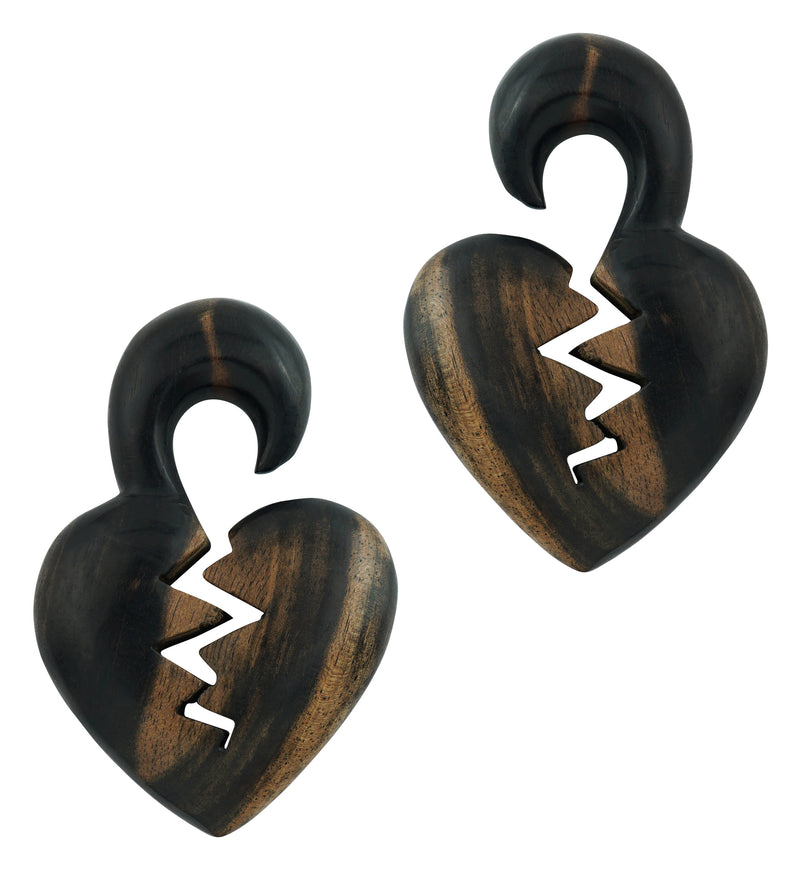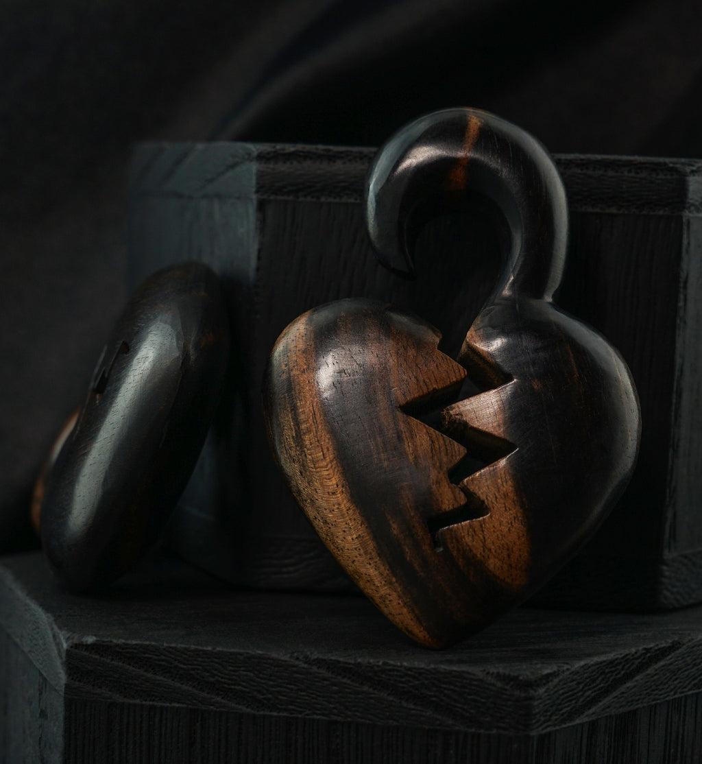 Sold as a pair, these Heartbroken Wooden Hangers feature a charming carved heart design made from areng wood. Available in sizes from 8G (3.2mm) to 1/2" (12mm), each handcrafted piece is unique in color and natural design due to the nature of the wood. We will do our best to match you with a complementing pair. Perfect for healed lobes, these earrings add a playful touch to your look. Please note, they are not intended for ear stretching.