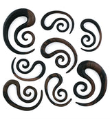 Our Helical Areng Wooden Spiral Hangers come in a range of 8G (3mm) to 1/2" (12mm) sizes with an additional 18G size for regular piercings. Carefully crafted by hand, each piece boasts a unique and smooth spiral design made from areng wood. Please note that the pattern and color of each hanger may vary. Additionally, each piece is slightly unique in terms of color and pattern - we will do our best to get you a matching pair. Sold in pairs (2 pieces). NOTICE: Handle with care. These are fragile.