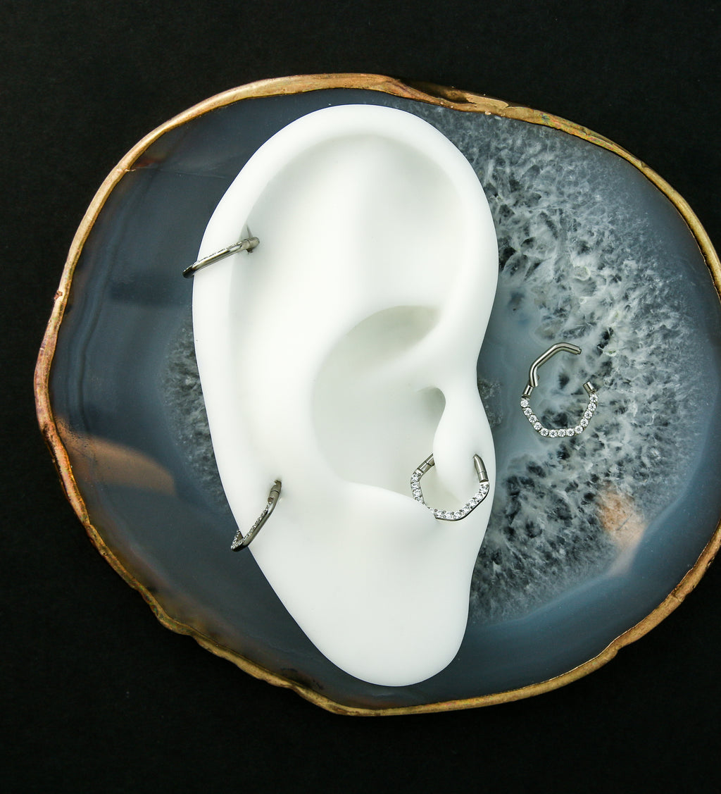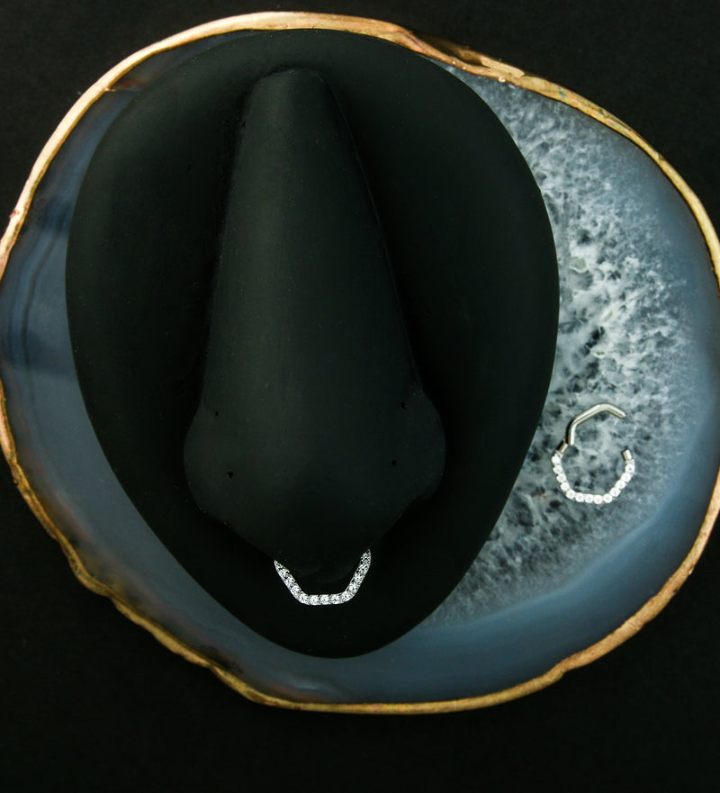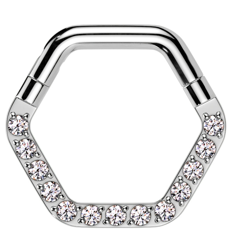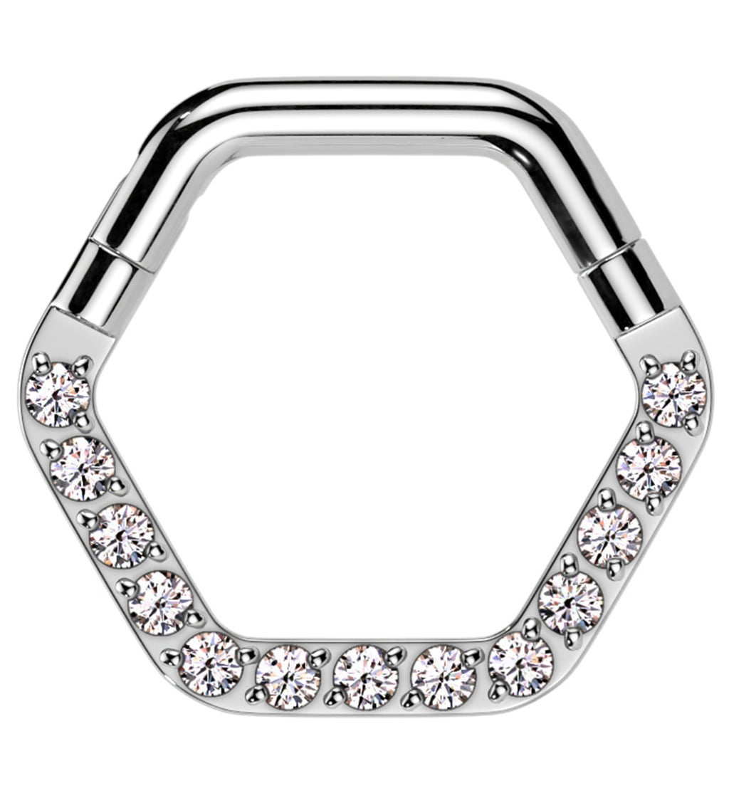 Geometric hinged segment ring made from durable 316L stainless steel with a hexagon hoop shape and a front-facing row of clear cz gems around the outside. Size is 16G with an inner diameter size of 5/16"(8mm). The hinged design makes this piece easy to insert and take out. Sold individually (1pc).