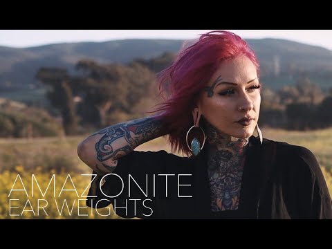 Striking amazonite stone ear weights that have a pointed hoop design. Made from natural amazonite stone. Must be 6G or bigger to wear. They weigh about 18 grams each. They measure 50mm x 75mm. Hoop is made from brass. Brass is not meant for long term wear. It may oxidize under extreme moisture conditions. Sold in pairs (2pcs).