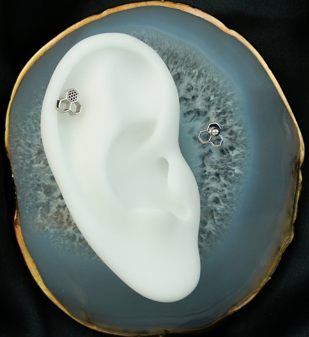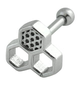 Cartilage/tragus barbell with triple hexagon shape, one of which is filled with a honeycomb design and the other two are cutouts. Made from 316L stainless steel and externally threaded. Cool piece for cartilage or tragus piercings! Size is 16G with a bar length of 1/4" (6mm) with a 2.5mm externally threaded ball end. Top size is 7mm. Sold individually. For healed piercings.