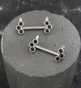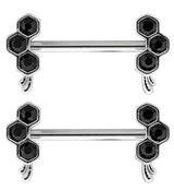 Black nipple barbells with a triple hexagon black cz design on either side, creating a honeycomb look. Made from 316L stainless steel. Size is 14G with a barbell length of 9/16" (14mm). Externally threaded. Intended for healed piercings. Sold in pairs (2 pcs).