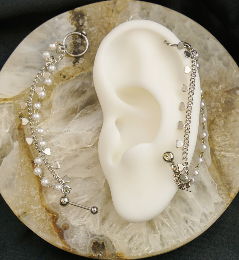 This stainless steel piercing chain is a double chain piece that you can use to connect two ear piercings! There is an externally threaded barbell on one end (both sides come off) and an annealed ring on the other. Both have wearable sizes 18G with a 5/16" (8mm) length and inner diameter. Connecting the two is a double chain design, one made out of synthetic pearls and the other steel hearts. The chain length measures about 64mm. On the barbell is a 4mm clear cz gem with another beaded, dangling clear cz gem attached. There is also a small, 1.5mm clear cz gem on the ring! Sold individually. For healed piercings.