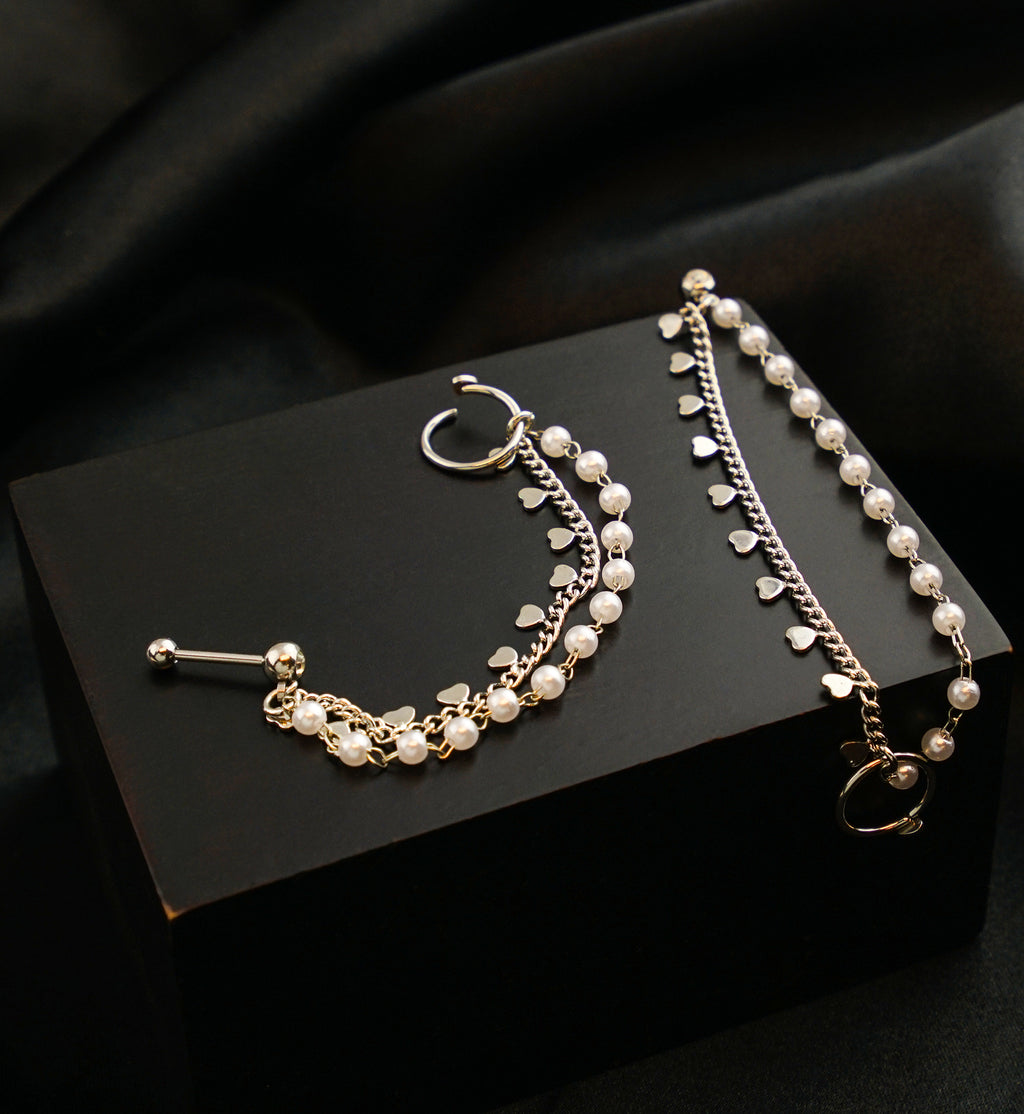 Hoop/Barbell Clear CZ Pearl And Heart Dual Piercing Chain